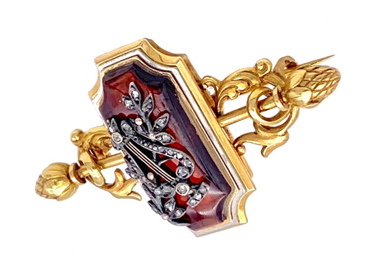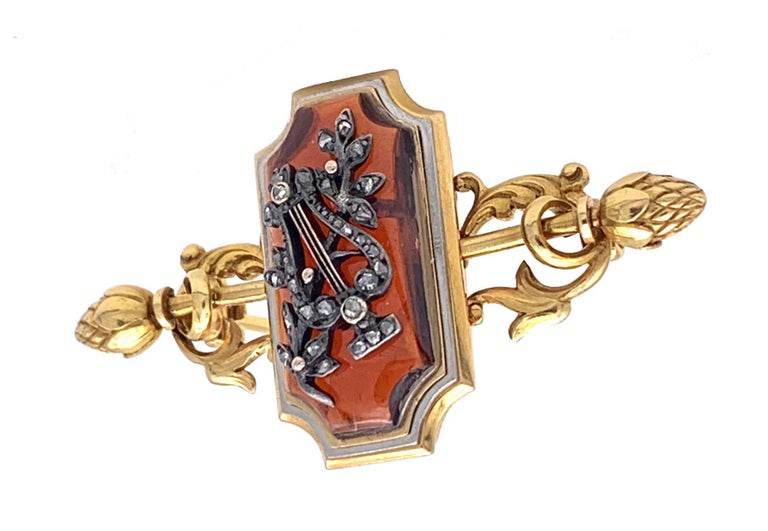 Antique Lyre Gold Brooch Apollos Instrument Flowers Diamonds Silver