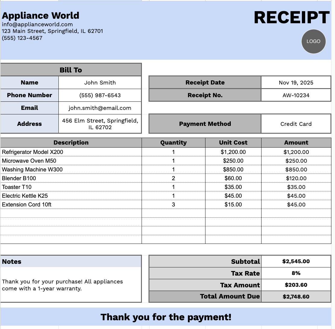 Free☝️ Appliance Receipt Template (Google Sheets Excel Word Google