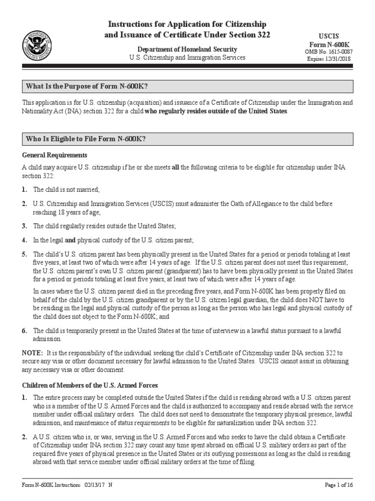 Download Instructions for USCIS Form N 600K Application for Citizenship