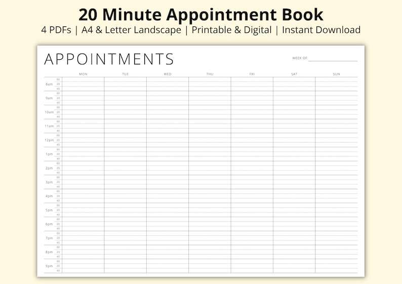 20 Minute Appointment Book 20 Min Interval Planner Template Weekly