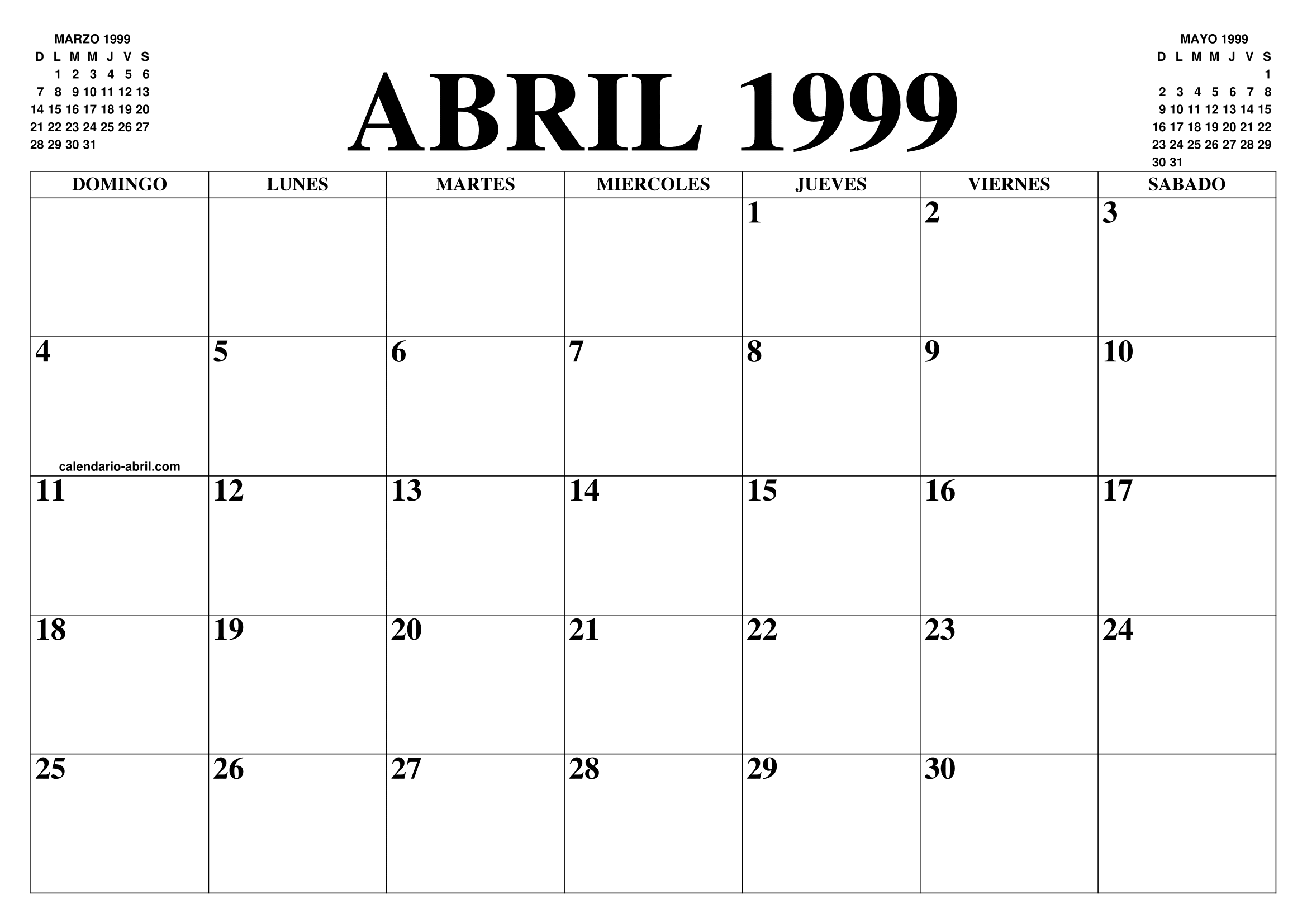 CALENDARIO ABRIL 1999 : EL CALENDARIO ABRIL PARA IMPRIMIR GRATIS MES