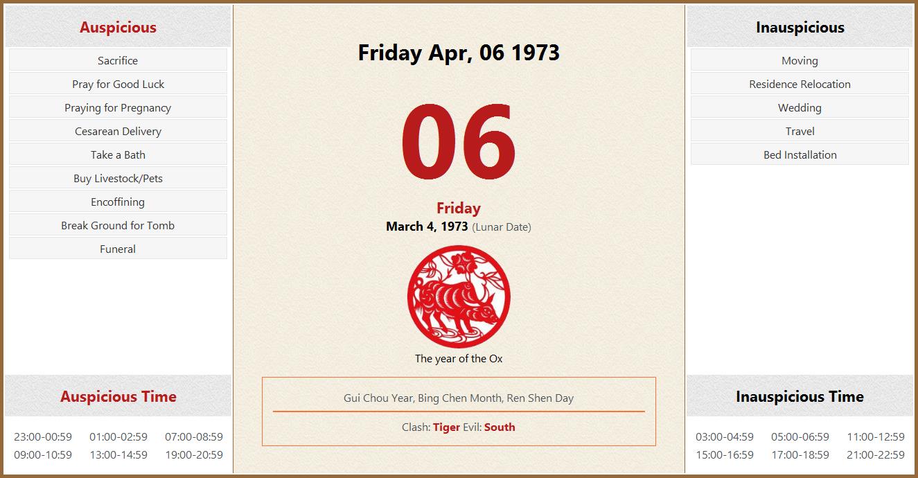 April 06 1973 Almanac Calendar: Auspicious/Inauspicious Events and