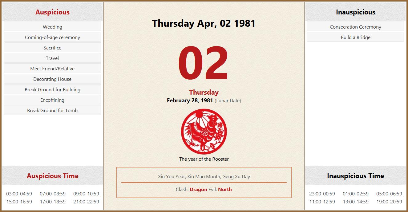 April 02 1981 Almanac Calendar: Auspicious/Inauspicious Events and