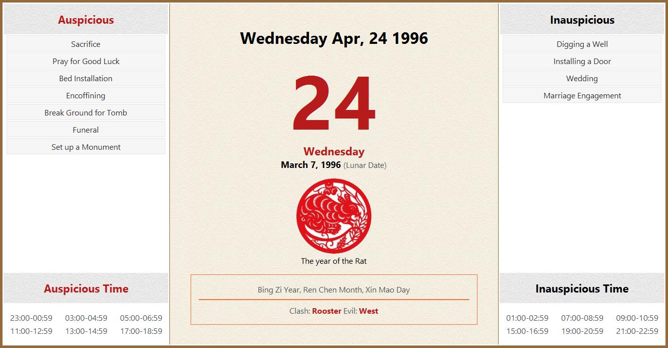 April 24 1996 Almanac Calendar: Auspicious/Inauspicious Events and