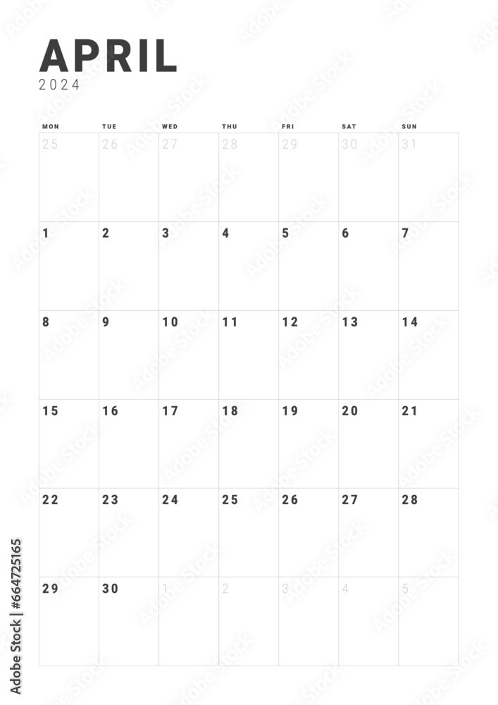 Monthly page Calendar Planner Templates of April 2024 Vector layout of
