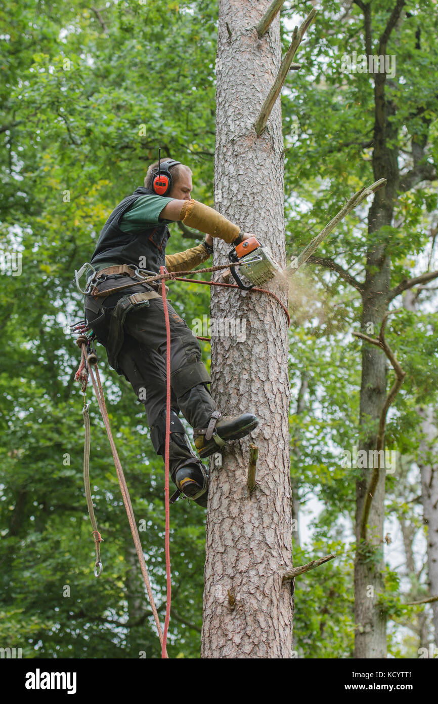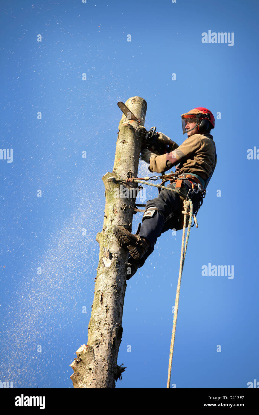 An arborist cutting a tree with a chainsaw Stock Photo Alamy