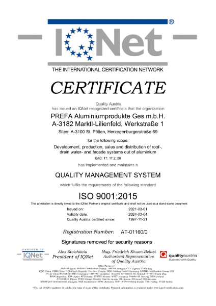 IQNet ISO 9001 Certificate PREFA UK Ltd NBS Source