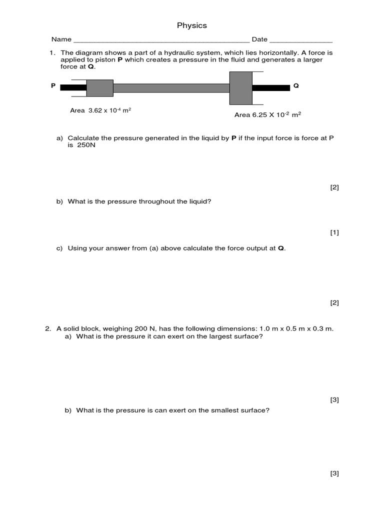 Physics Worksheet Archimedes Principle and Pressure Pressure Density
