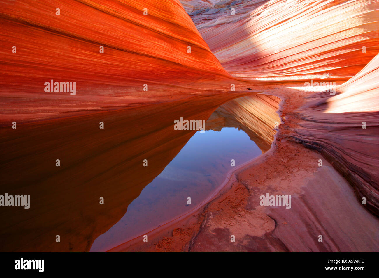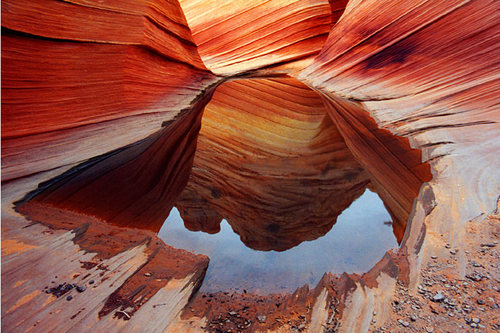 Striated sandstone reflected in seasonal pool of water The Wave Coyote