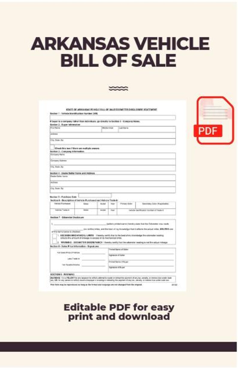 Arkansas Vehicle Bill of Sale Template Printable Editable PDF for