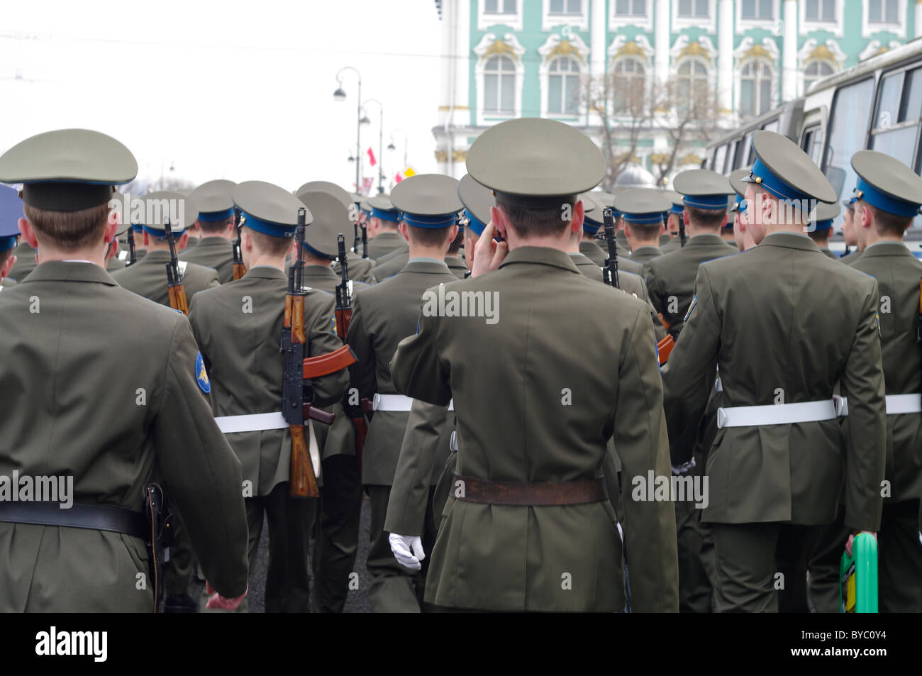 The parade of Russian soldiers on the Palace Square in St Petersburg