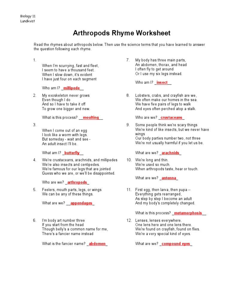 Arthropod Rhyme Worksheet Key PDF Worksheets Library
