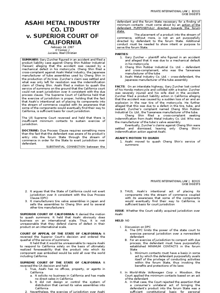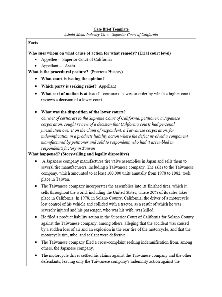 Asahi v Superior Court of California Case Brief Template Ashahi