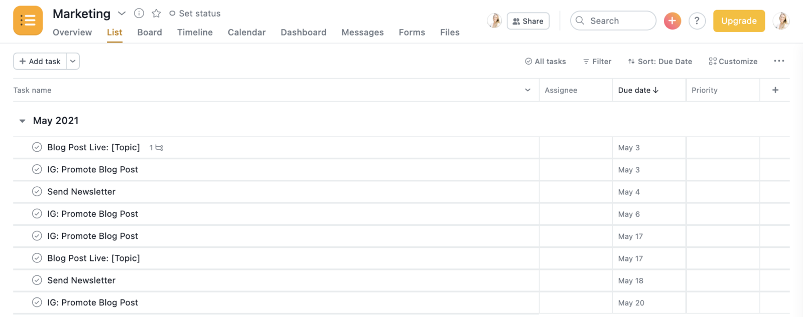 Asana Calendar: How to Create a Simple Content Calendar Miss Task