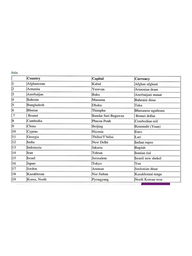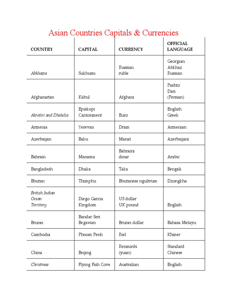 Asian Countries Capitals PDF Currency Economy Of Asia