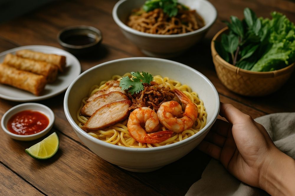 A Delicious Bowl of Noodle Soup with Tender Pork and Fresh Herbs