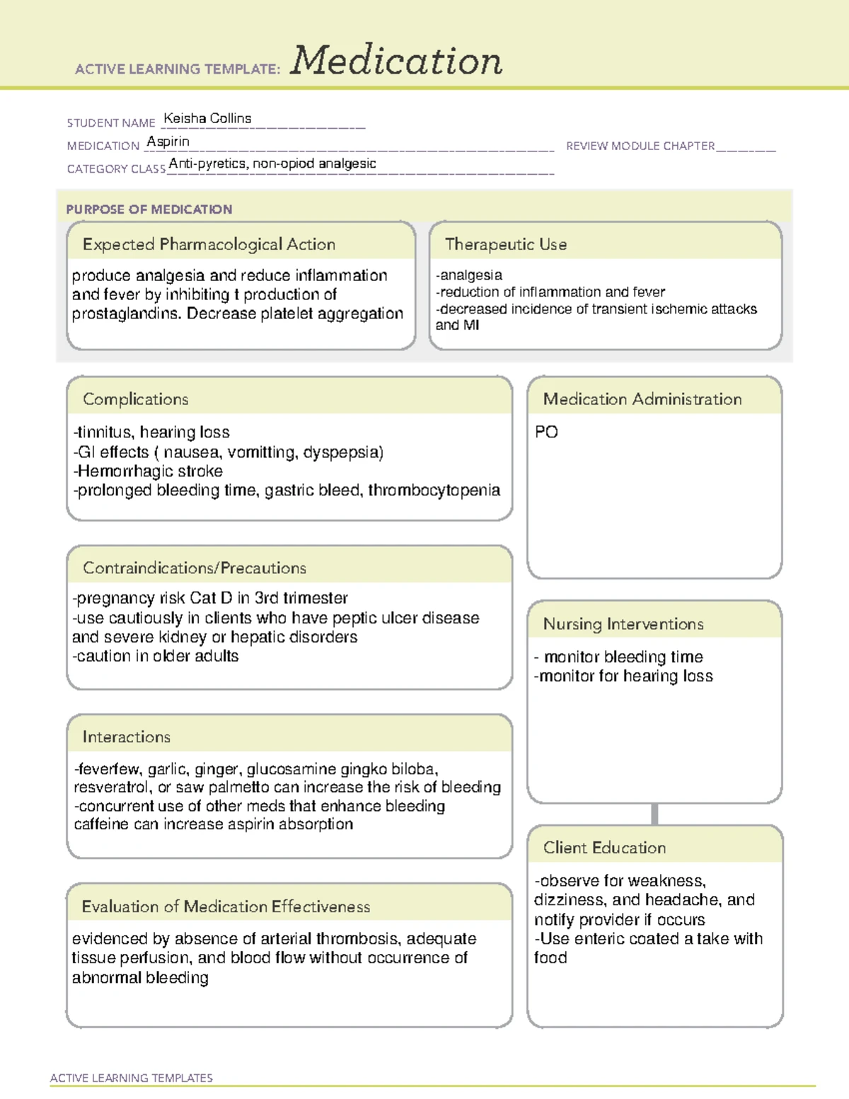 Aspirin medication template ACTIVE LEARNING TEMPLATES THERAPEUTIC