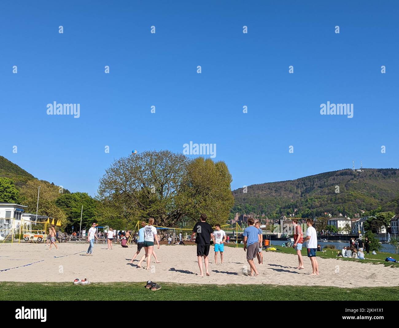 The people playing in a beach volleyball court against trees in