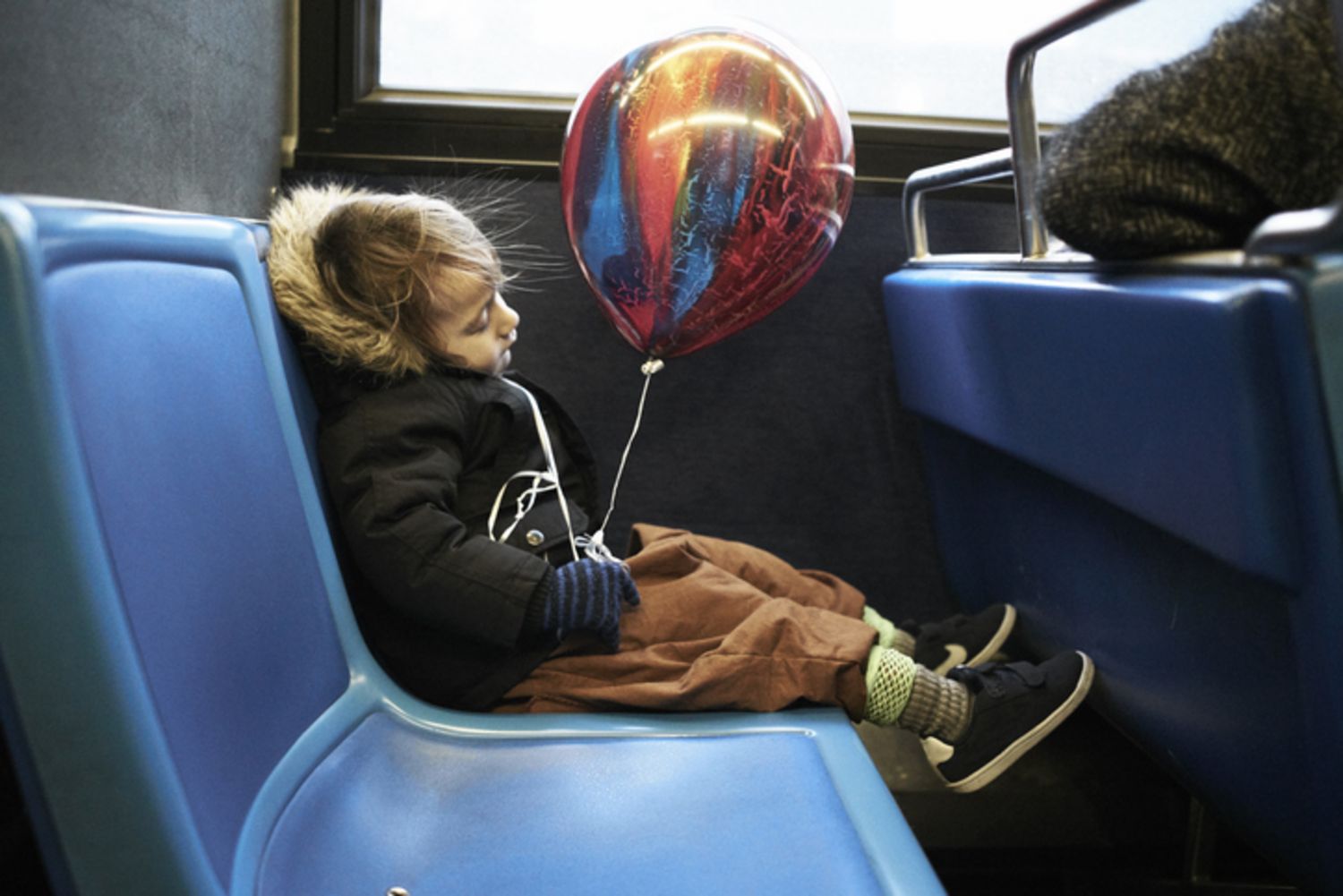 Cute Little Boy Playing with Pink Balloon in the Train While It Moving