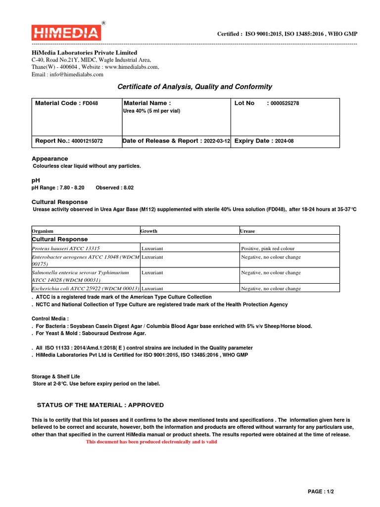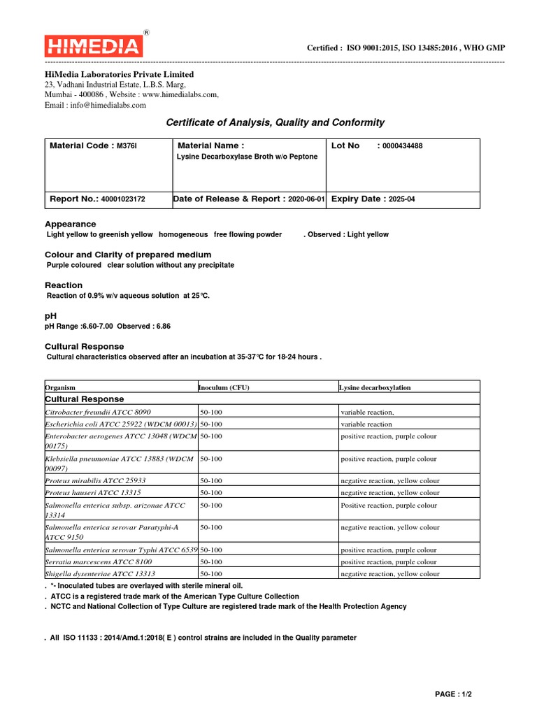 Certificate of Analysis Quality and Conformity: Himedia Laboratories