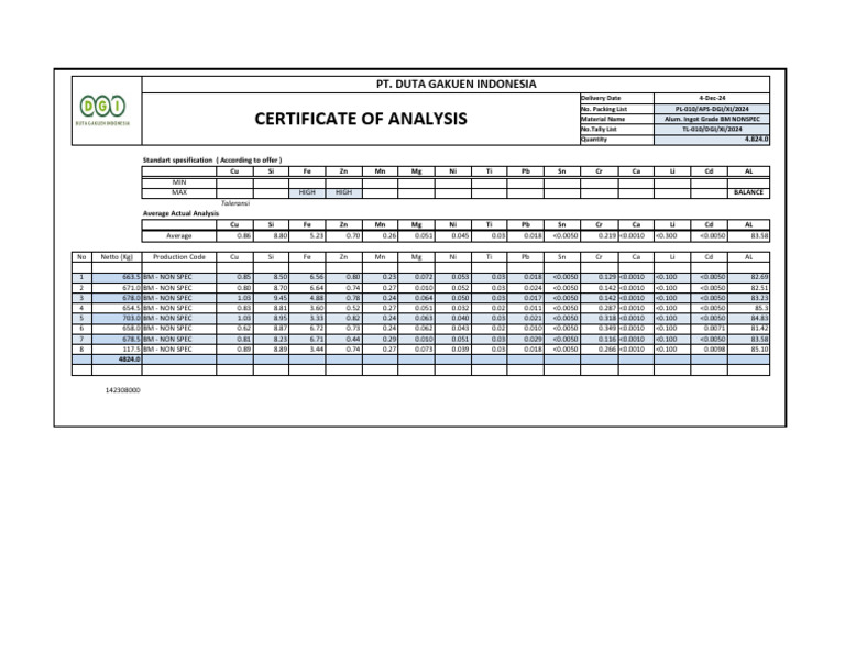 CERTIFICATE ANALYSIS 04 DECEMBER 2024 PDF Elementos metálicos