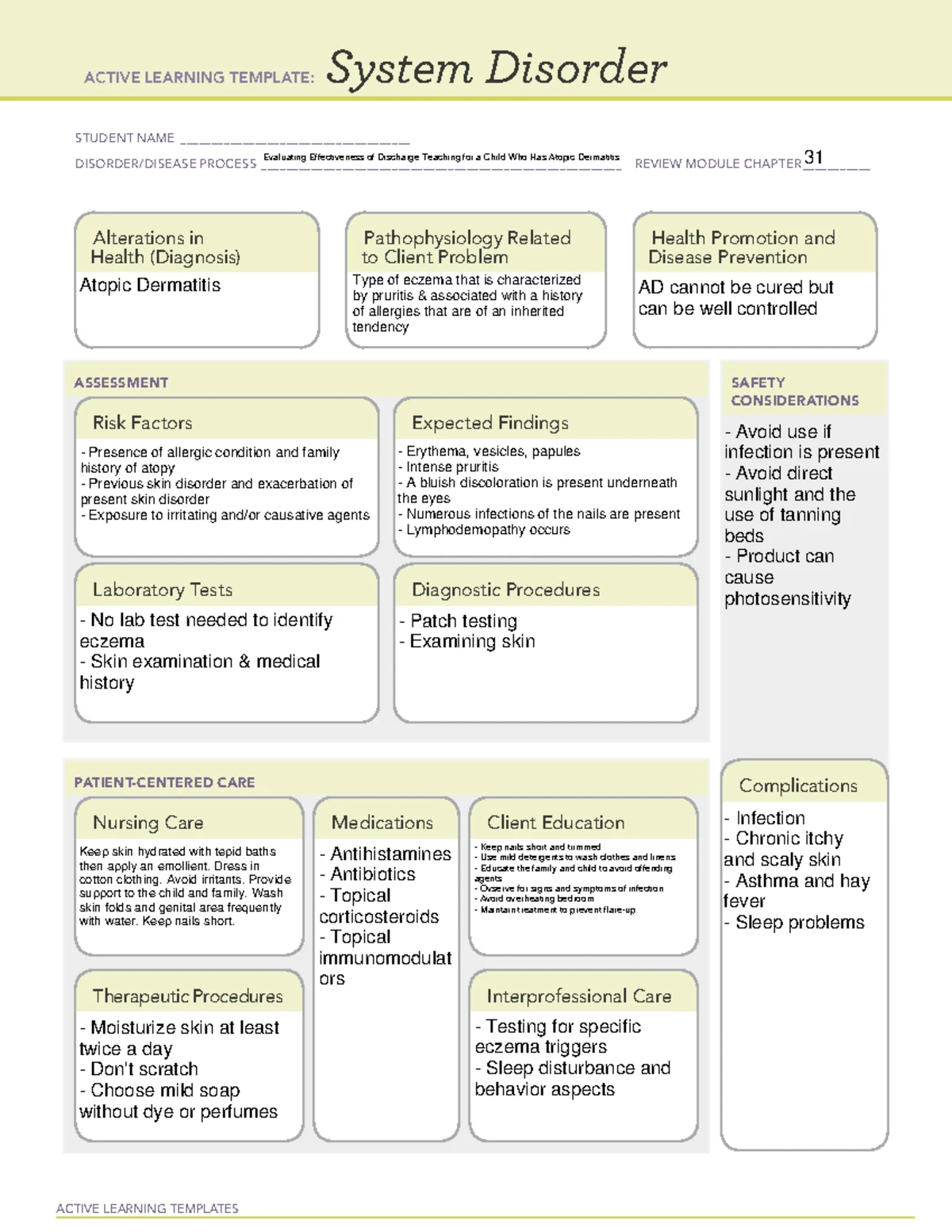 Dermatitis ATI ACTIVE LEARNING TEMPLATES System Disorder STUDENT