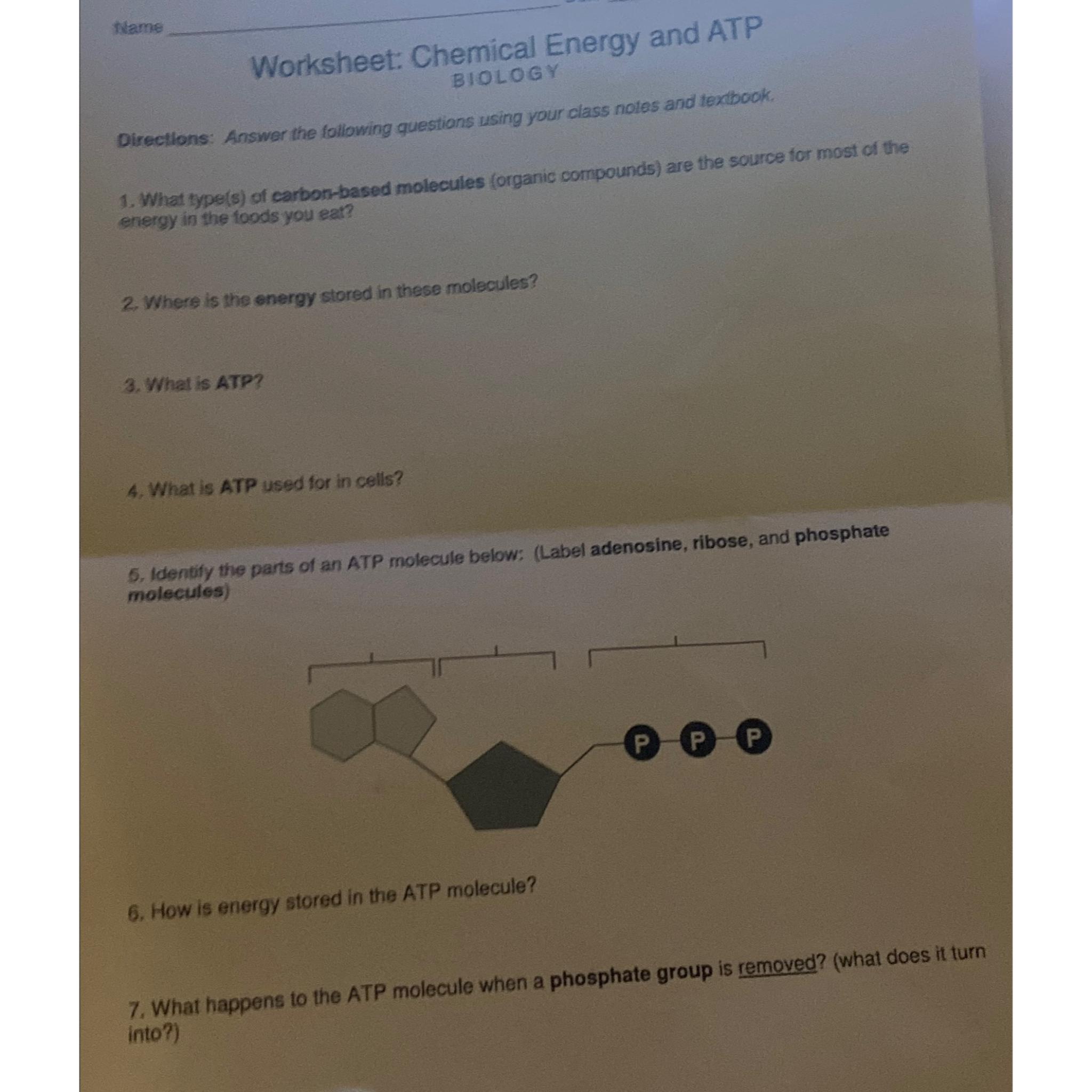 Chemical Energy and ATP Worksheet: Biology High School