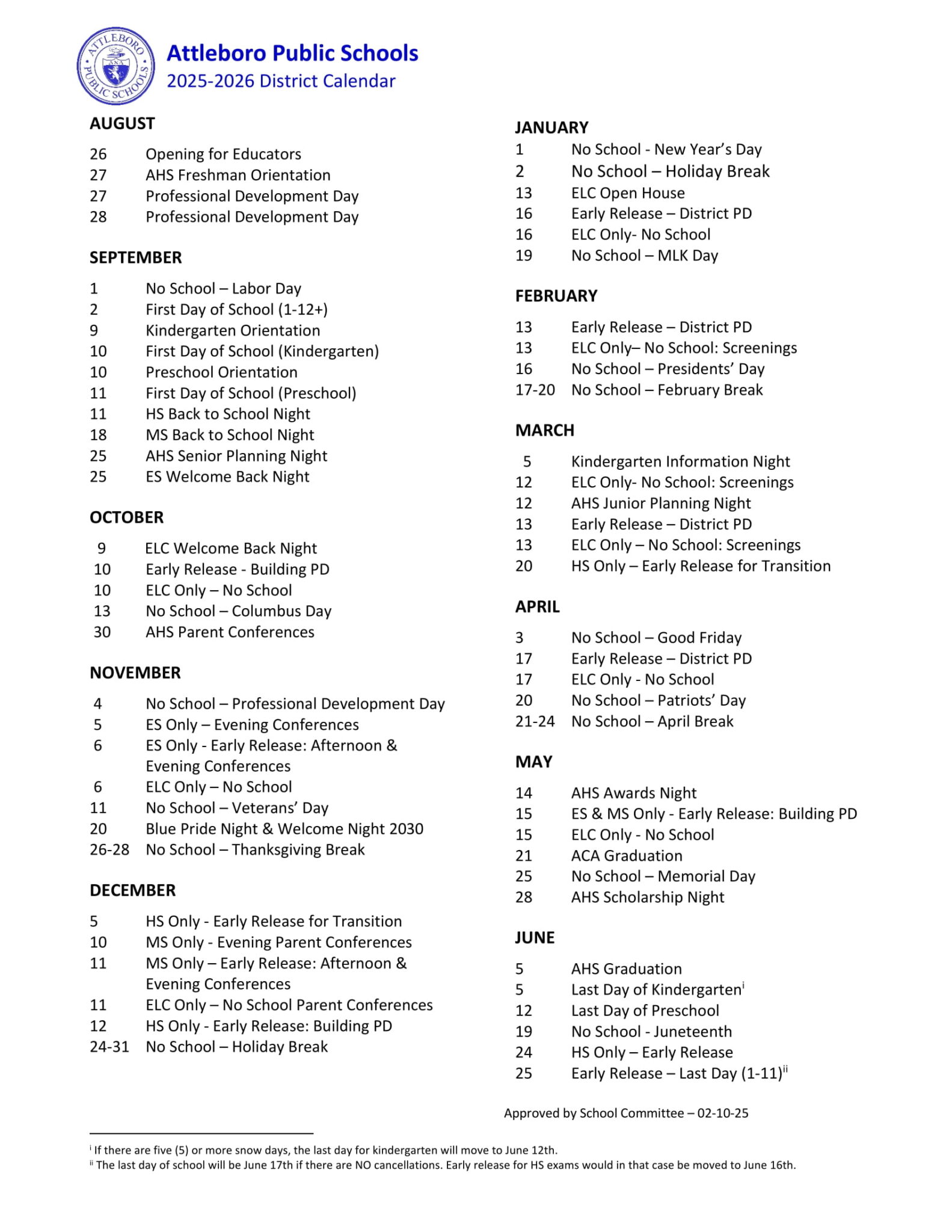 Attleboro Public Schools Calendar 25 26 Revised PDF EduCounty