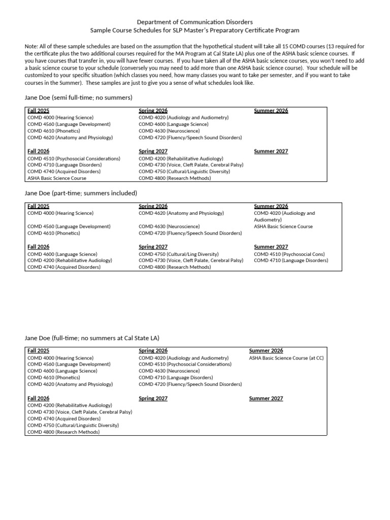 Sample Schedules SLP Master #39 s Certificate PDF Speech Audiology