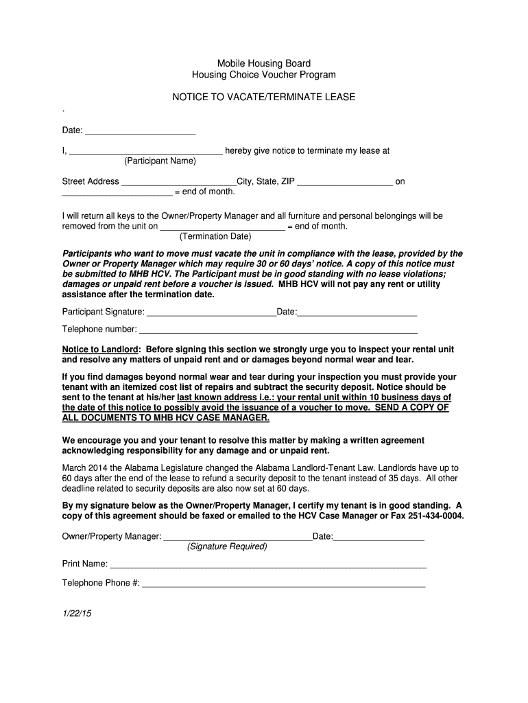 Fillable Online mobilehousing HCV Notice to Vacate 1 22 15 for