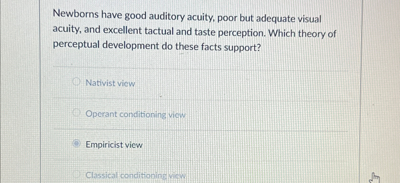 Solved Newborns have good auditory acuity poor but adequate Chegg com
