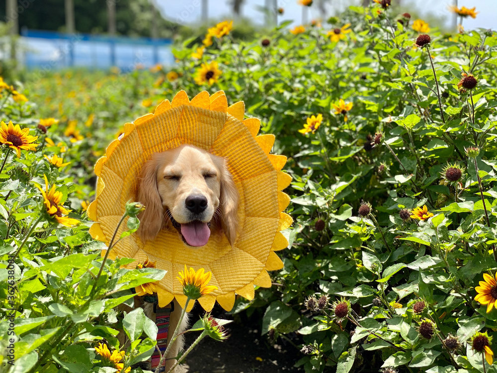 Premium AI Image A dog in a field of sunflowers with the word golden