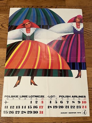 Original Vintage Poster LOT Polish Airlines August 1975 Calendar Travel