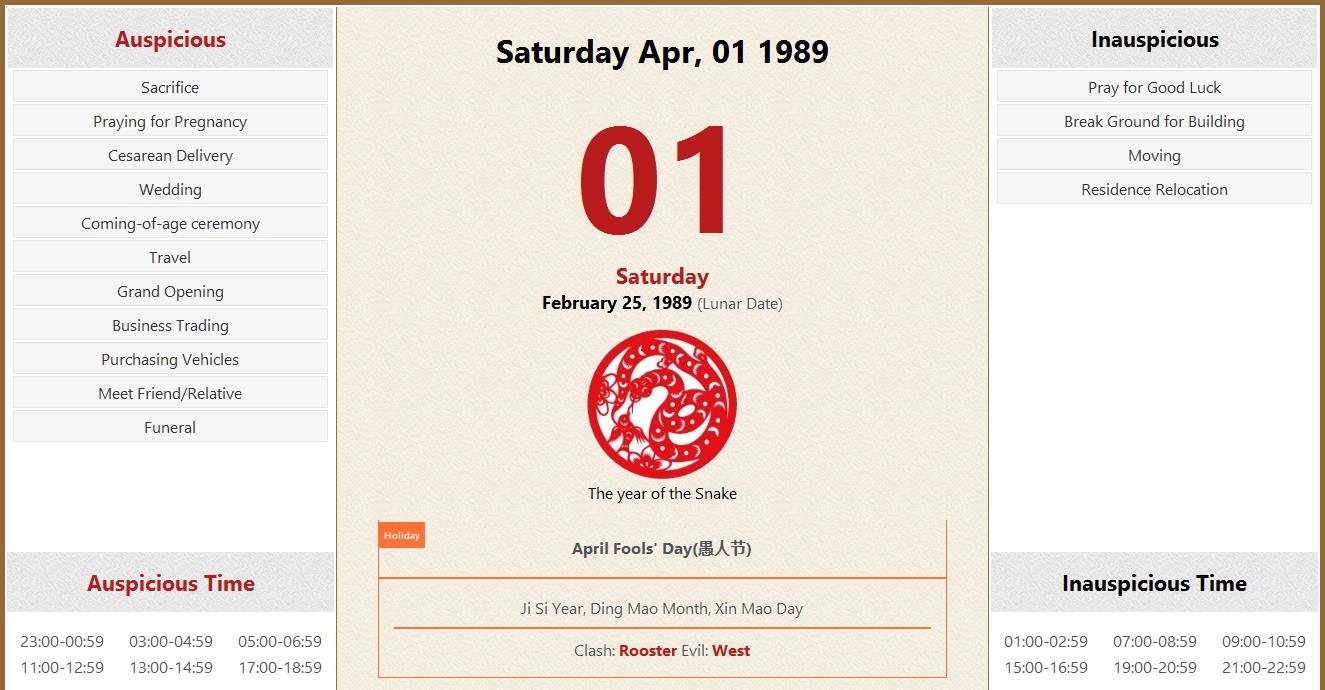 April 01 1989 Almanac Calendar: Auspicious/Inauspicious Events and