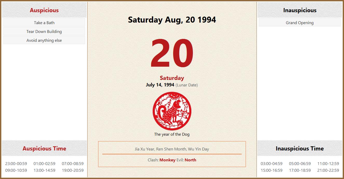 August 20 1994 Almanac Calendar: Auspicious/Inauspicious Events and