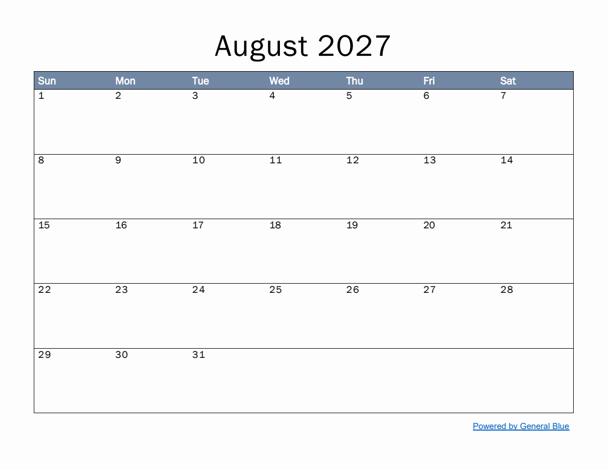 August 2027 Calendar Printable