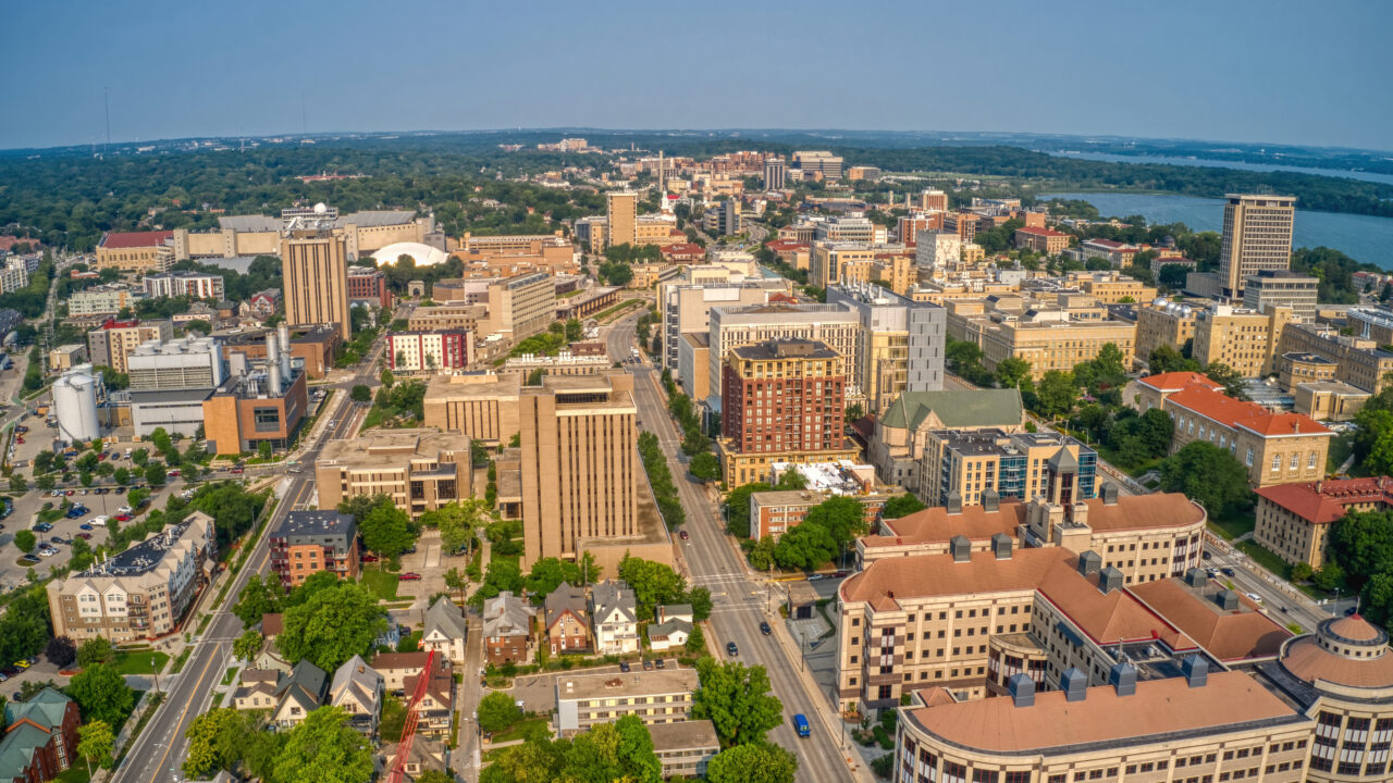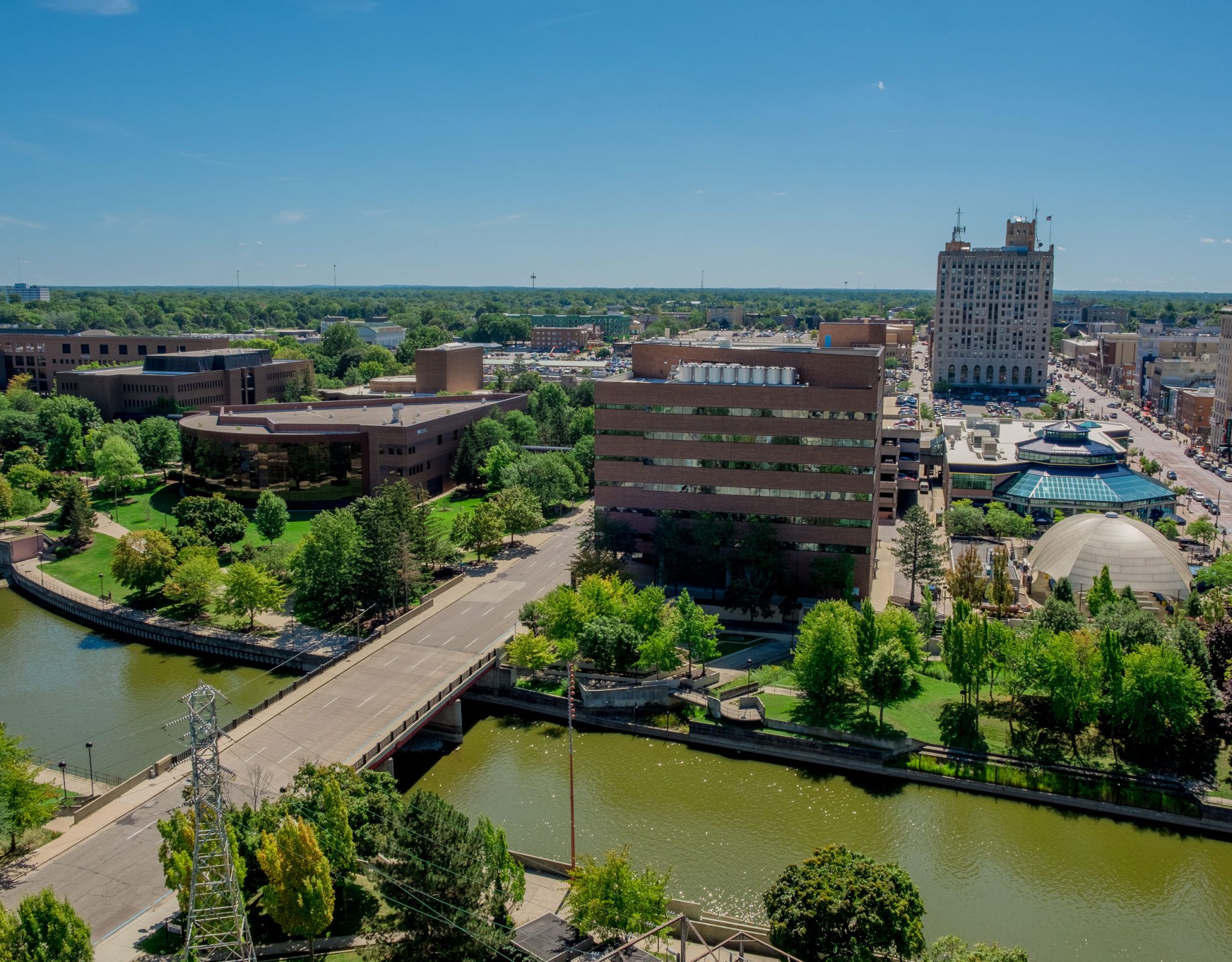 Aerial Of Downtown St Cloud Minnesota On Overcast Day With Lake George