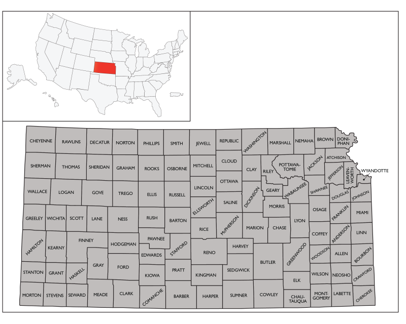 Map of Kansas with pin of country capital Kansas Map with neighboring