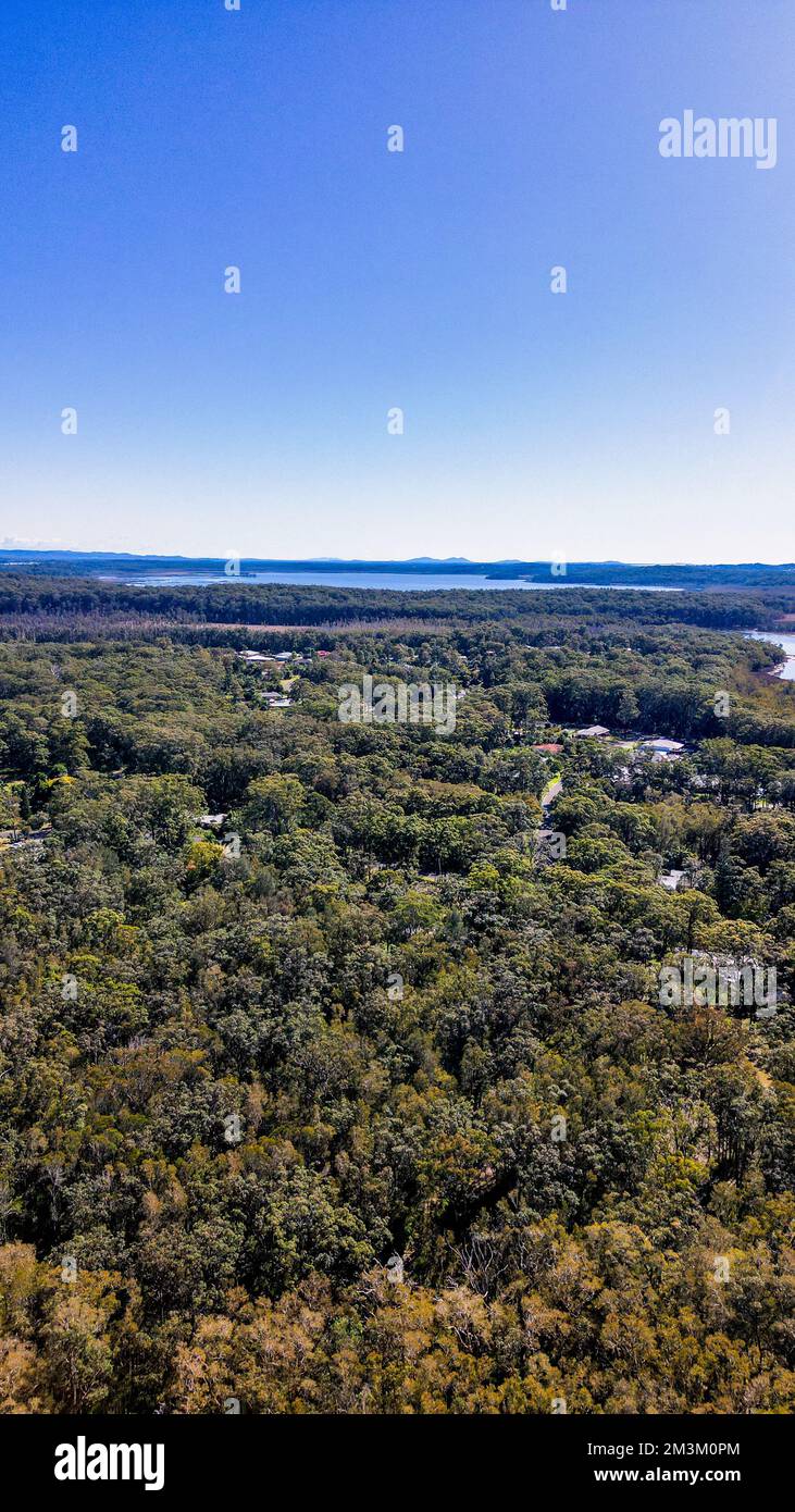 A vertical aerial view of Lake Cathie with a blue sky in the background