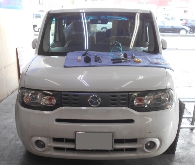 日産・キューブ(Z12)飛び石によるフロントガラスリペア事例 日産車のフロントガラス交換修理の事例紹介『ジャパンオートガラス』