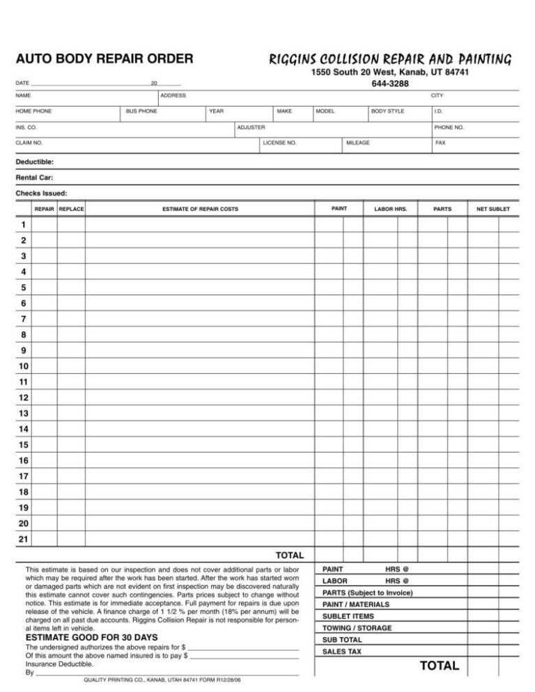 Auto Repair Estimate Template With Insurance Info Also Used as an Auto