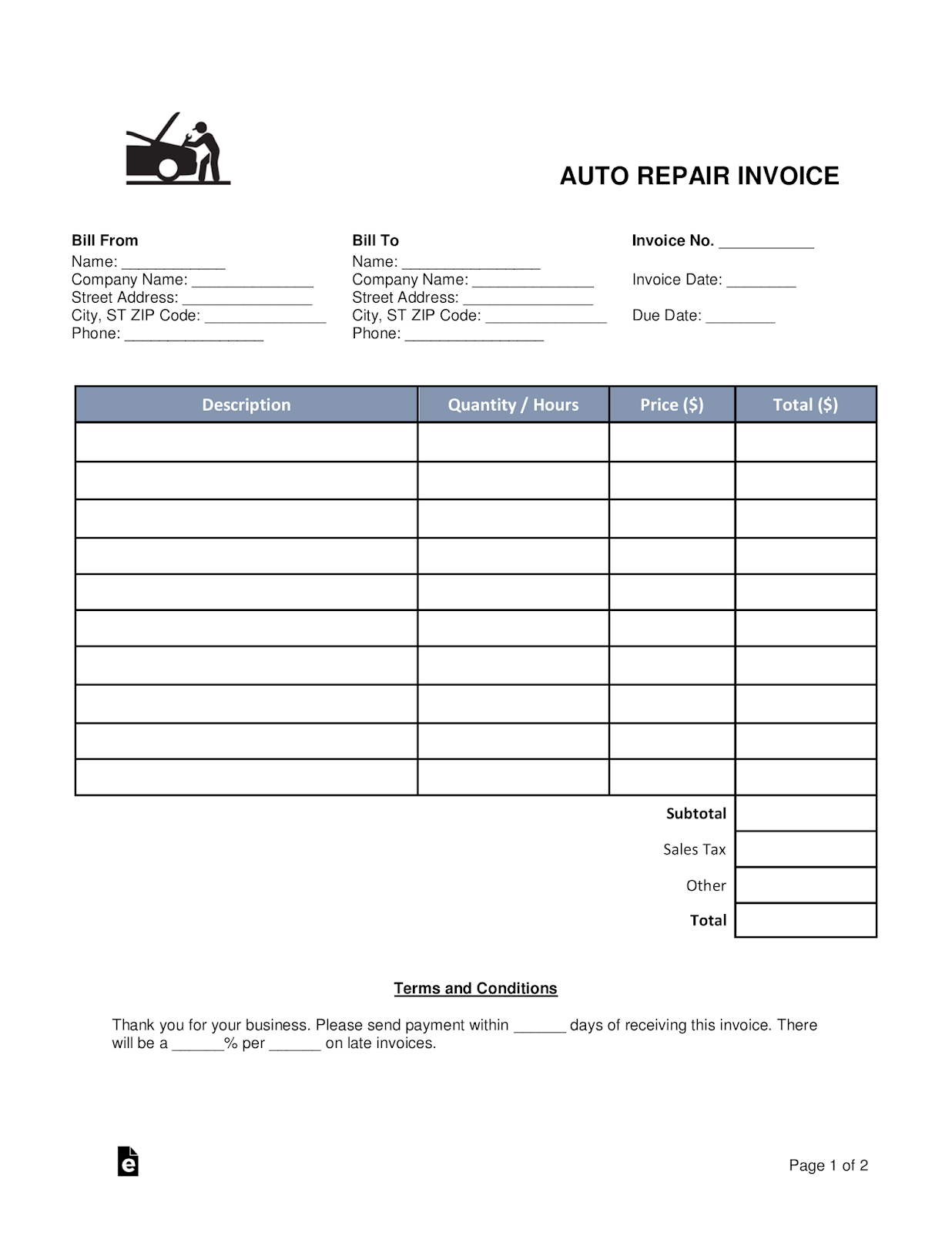 Free Auto Repair Invoice Template Customize and Send in 90 Seconds
