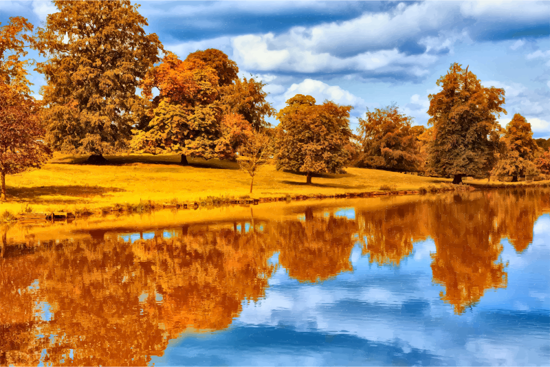 Trees are reflected in the water of a lake in the fall SeaArt AI