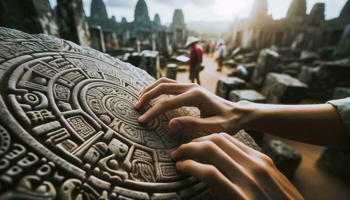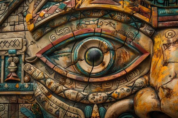 Close view of the ancient Aztec mayan calendar with round pattern and