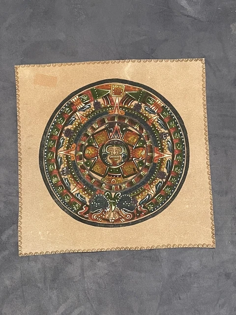 AZTEC CALENDAR Sun Stone on Leather Cloth Hand Painted Mayan Hammered £