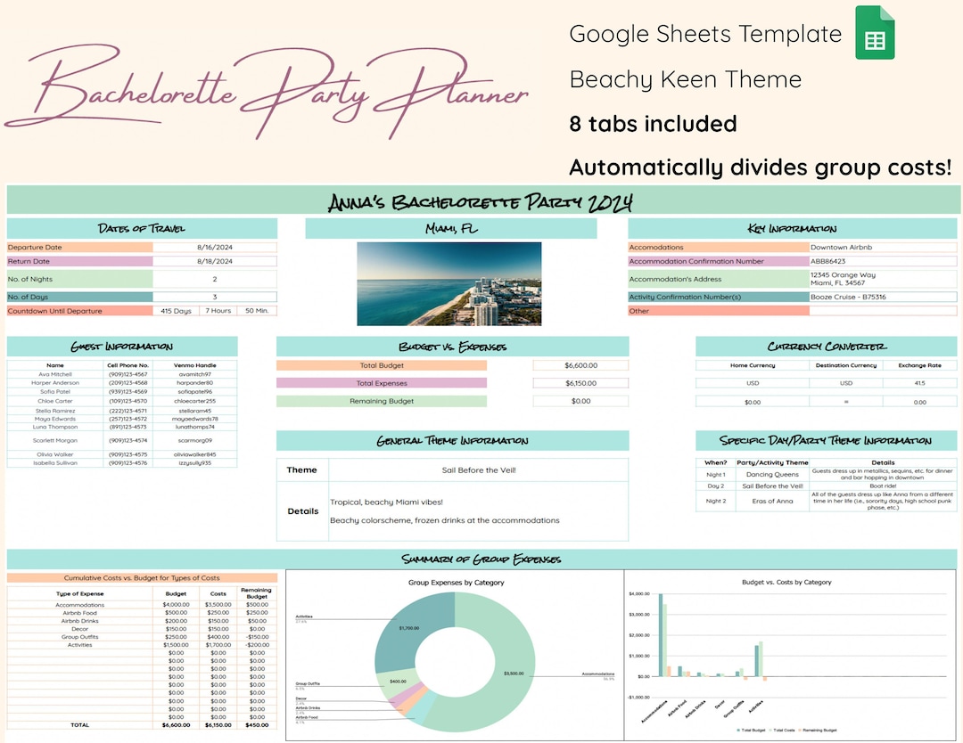 Bachelorette Party Planning Template With Budget Tracking and Cost
