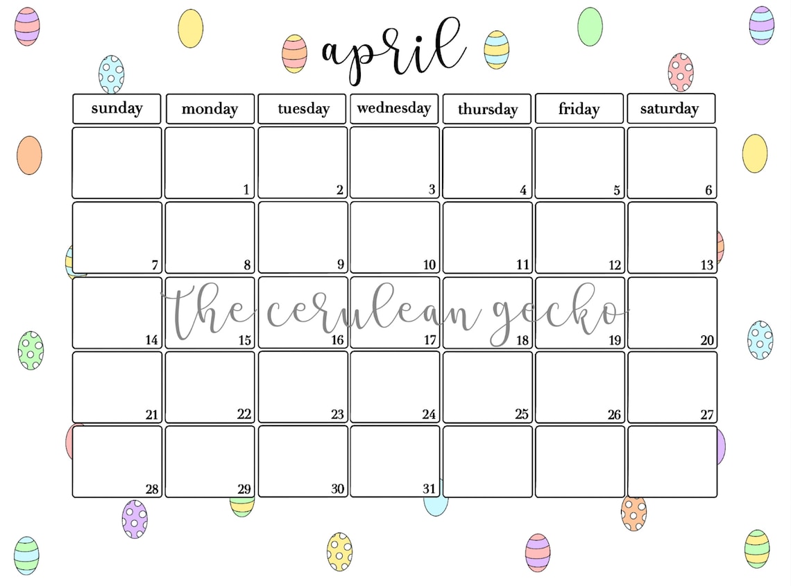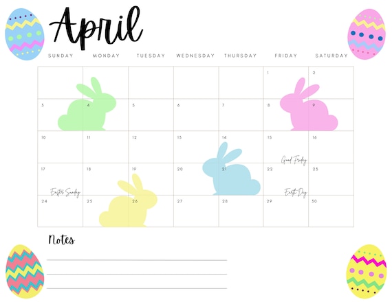 April Calendar 2022 Printable Easter Bunny Easter Eggs Etsy