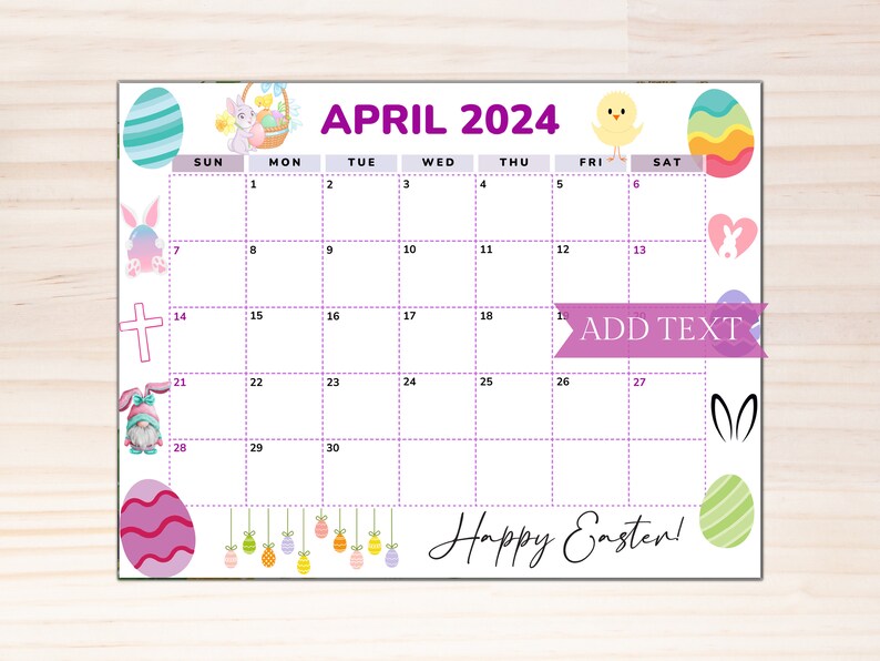 EDITABLE Printable April Calendar 2024 Cute Easter Calendar Printable