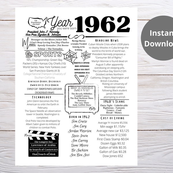 1962 the Year You Were Born PRINTABLE 1962 PRINTABLE Etsy Birthday