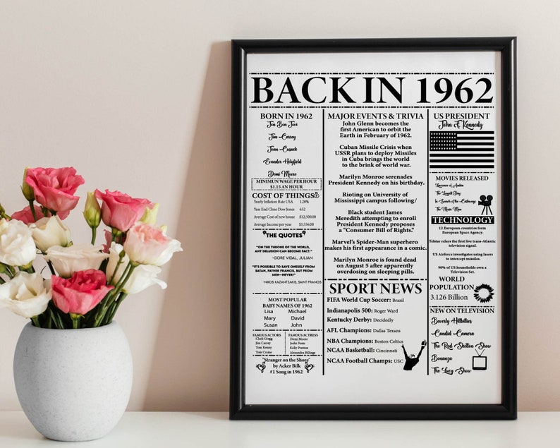 Back in 1962 Newspaper Poster Printable 60th Birthday Etsy Australia
